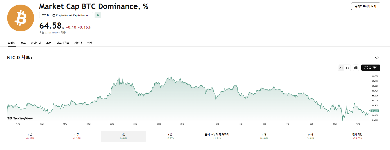 이 수치는 비트코인이 시장에서 얼마나 지배적인 위치를 차지하고 있는지를 나타냅니다.