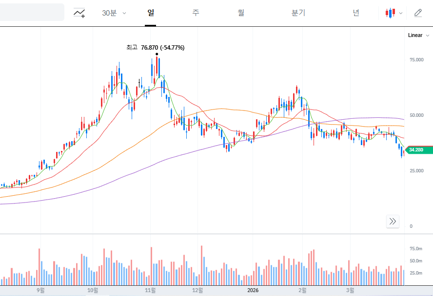 업계에서는 실적 발표 이후 주가가 급락하는 등 단기 변동성이 매우 큰 종목으로 평가됩니다.